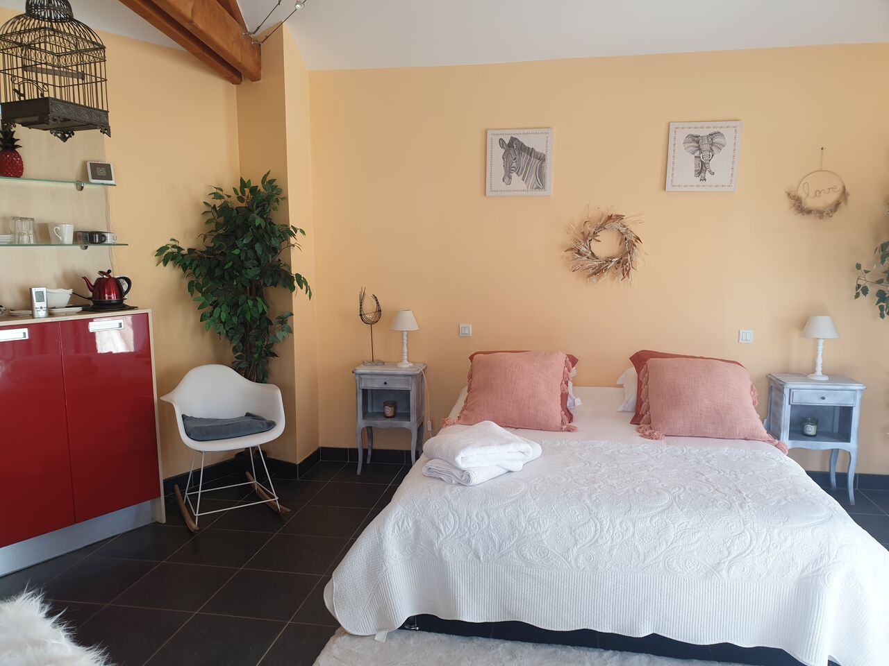 Vous aurez à votre disposition une chambre spacieuse, avec salon et coin repas. Elle est équipée d'un lit double en 160 x 200 cm, d'une salle d'eau avec douche, d'un téléviseur et d'une connexion WIFI.